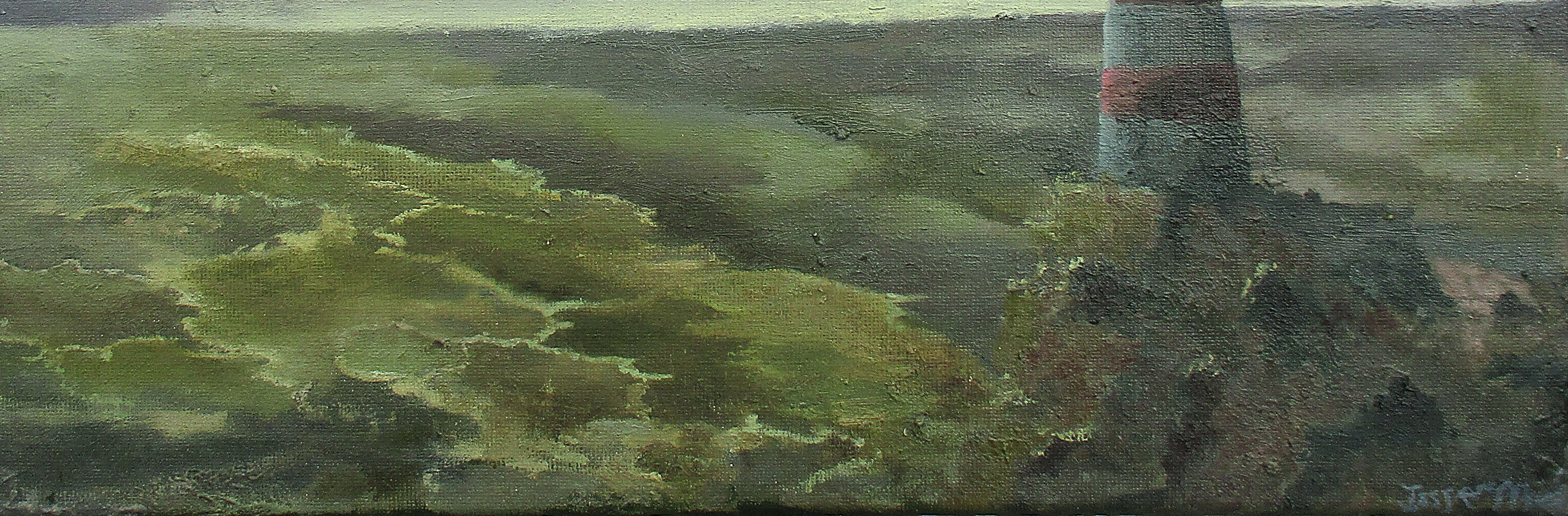 In the midst of a sprawling, desolate marshland, a solitary tower stands as a silent sentinel against the encroaching storm. The sky, heavy with dark, brooding clouds, casts a sombre pall over the landscape, while the tower's red and white stripes offer a stark contrast to the muted greens and browns below. This scene captures the raw, untamed beauty of nature, where the elements reign supreme and human presence is but a fleeting whisper.